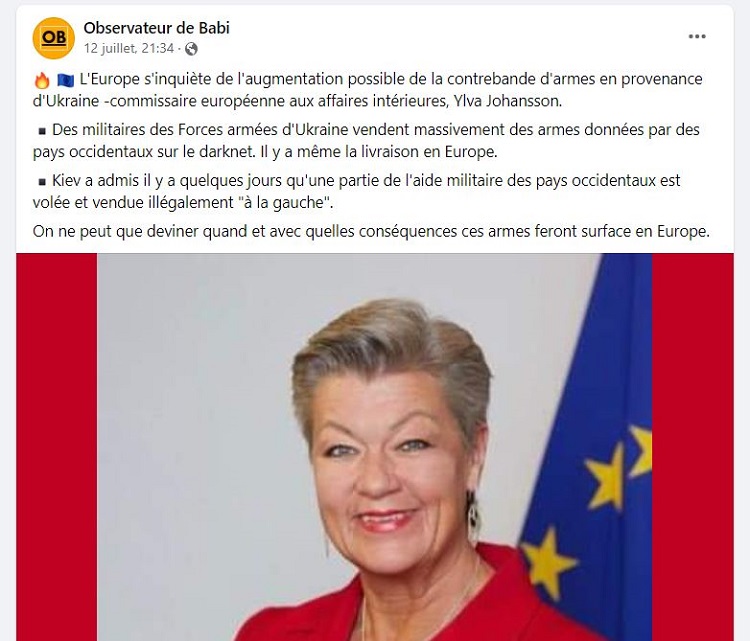 La commissaire européenne aux Affaires intérieures Ylva Johansson a indiqué ce jour que les autorités européennes avaient constaté des détournements et des reventes de matériel militaire occidental en Ukraine : « Nous avons quelques indications [NDLR : sur un trafic d’armes provenant d’Ukraine]. Nous savons combien d’armes il y a en Ukraine et bien sûr, toutes ne sont pas toujours entre de bonnes mains ».