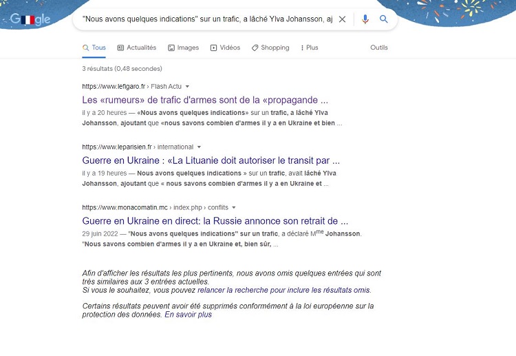 En réalisant une recherche via Google avec la citation de la première publication Facebook, nous retrouvons une dépêche de l’Agence France Presse (AFP) reprise par Le Figaro et Le Journal de Montréal. Dans cette dépêche, l’AFP ne parle de trafiquants d’armes au sein de l’armée ukrainienne et reste fidèle aux propos de Ylva Johansson.