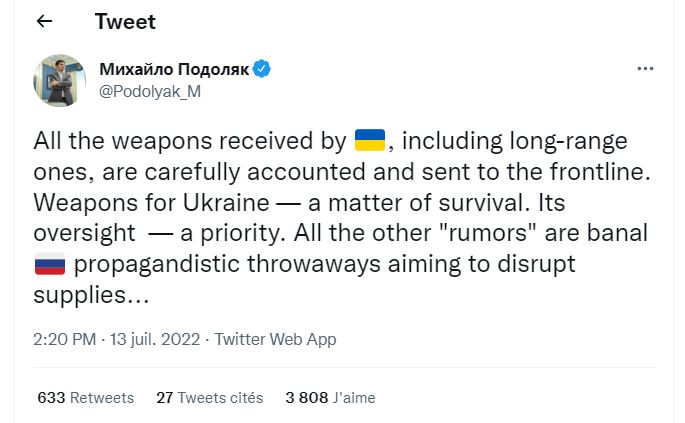 « Toutes les armes reçues par l’Ukraine, y compris celles à longue portée, sont soigneusement comptabilisées et envoyées sur la ligne de front. Des armes pour l’Ukraine – une question de survie. Sa surveillance – une priorité. Toutes les autres « rumeurs » sont de banales jetées propagandistes russe visant à perturber les approvisionnements…. » a-t-il martelé.