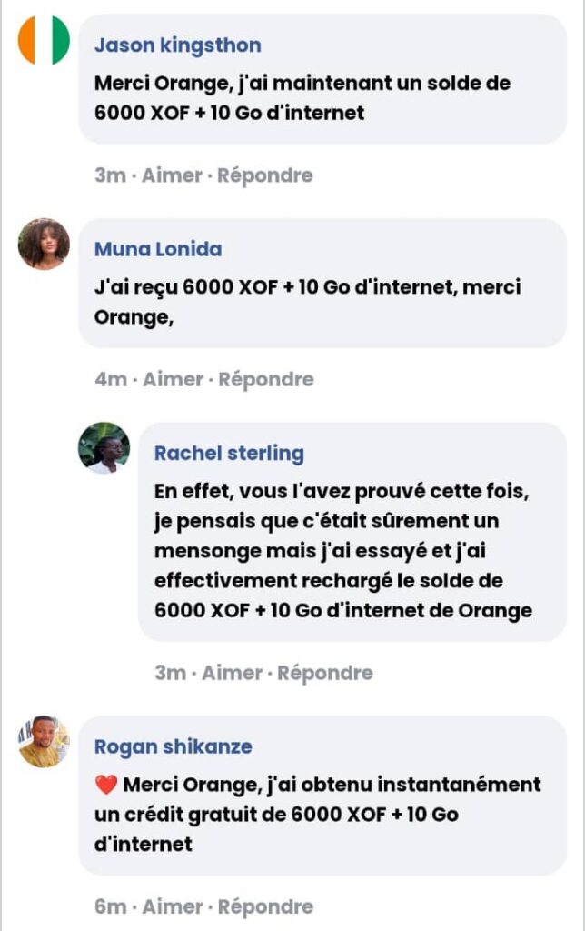 Le message qui circule le plus est une censée être une offre de gratuité de data internet venant de trois compagnies de téléphonie mobile. Orange, MTN et Moov Africa sont supposés s’associer pour offrir 6000 f de crédit d’appel et 10 Go de crédit internet. Afin de bénéficier de cette offre, le client doit disposer d’un carte SIM de plus d’un an.