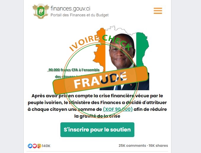 Le site internet dont l’identité est RASEDCOM semble être utilisé pour des arnaques à grande échelle sous différentes identités. L’interface change peu après avec la photo du Président Alassane Ouattara. Le même site propose au même instant une aide du Ministère des Finances qui « a décidé d’attribuer à chaque citoyen une somme de (XOF 90.000) afin de réduire la gravité de la crise ».