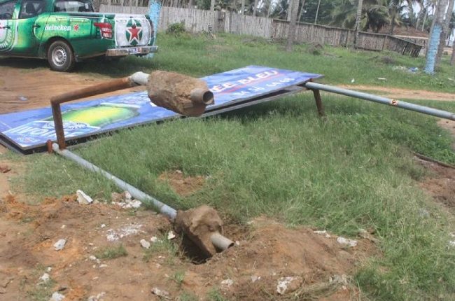Pancartes, équipements à l’effigie de la marque orange et bleu, IVOIRE, on peut le dire sans exagérer a conquis cet espace. Cependant, cette activité marketing qui fait le bonheur des consommateurs de cette bière a été perturbée de la plus honteuse des façons. De fait, tôt ce samedi 27 mai 2017, plusieurs pancartes estampillées IVOIRE ont été vandalisées. Sans préavis, des inconnus selon des jeunes riverains sont venus détruire les affiches visibles dans plusieurs espaces de plaisance.