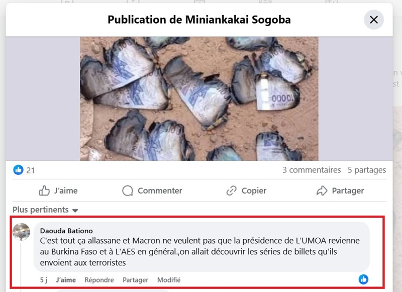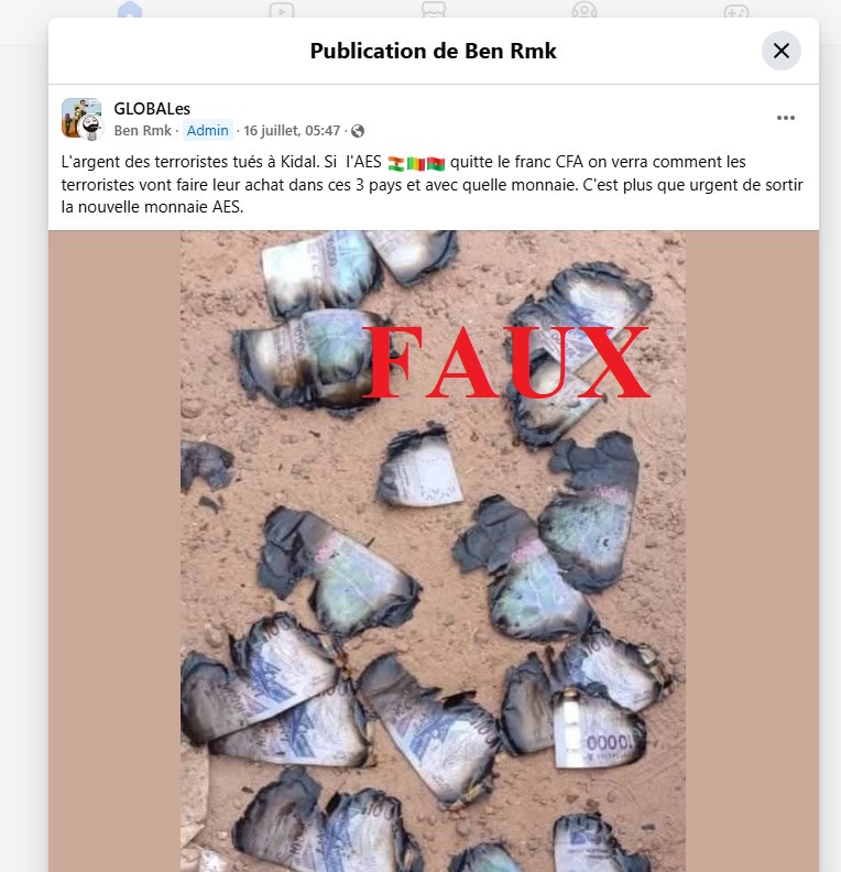 La sortie du franc CFA des pays membres de l’Alliance des Etats du Sahel (AES) est un sujet qui alimente le débat sur la toile. Dans des groupes Facebook, plusieurs personnes soutiennent que cette monnaie est le symbole de l’impérialisme, du colonialisme et de la servitude. Le franc CFA est surtout une monnaie contrôlée par la France, l’ennemi des pays de l’AES. La monnaie sert donc à financer le terrorisme. Pour montrer de nouveau que le francs CFA est un outil de financement du terrorisme, une image de billets de banque calcinés et censée avoir été prise à Kidal (Mali) fait le tour d’internet. Attention, cette image est décontextualisée : elle fait référence à l’origine à l’incendie d’un commerce en Côte d’Ivoire.