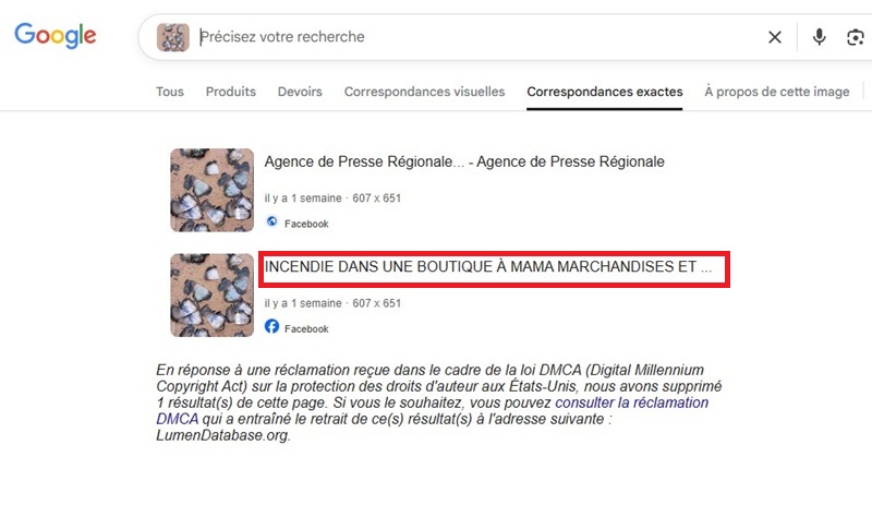 Une recherche par image inversée grâce à Google Images permet de constater qu’une page Facebook avait déjà publié cette photo le 13 juillet 2025, soit trois (3) jours avant que les pages pro-AES ne la détournent. L’image n’a pas été prise à Kidal mais en Côte d’Ivoire dans la localité de Mama. Elle fait partie d’un lot de trois images utilisées pour évoquer l’incendie d’un commerce.