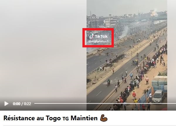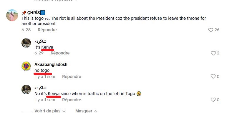 Une recherche sur le réseau social nous permet de retrouver effectivement la vidéo sur le compte @makofonyo3 (archivée ici). La vidéo a été mise en ligne le 25 juin 2025. Dans les commentaires, on remarque que certains internautes (en anglais) remettent en cause le fait que le Togo soit le pays d’origine des images. Plusieurs évoquent plutôt le Kenya, pays d’Afrique de l’Est qui est secoué par des protestations.