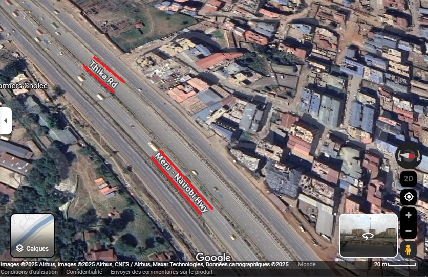 Une nouvelle recherche Google en utilisant le groupe de mot « Nairobi highway A2 » + « Nairobi highway A2 EXIT 8 » (highway pour autoroute) nous permet de retrouver le tronçon routier où la vidéo a été enregistrée. Google Map nous propose une voie où on peut lire « Thika Rd » (Rd=road) et « Meru-Nairobi Hwy » (Hwy= highway).