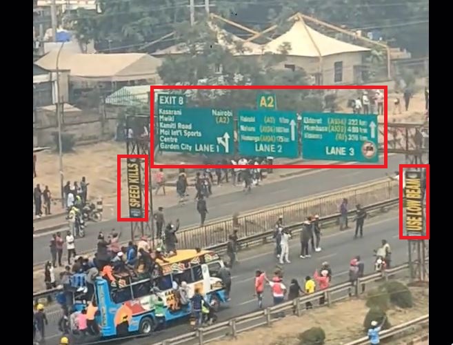 Sur la deuxième vidéo, un panneau d’affichage d’autoroute est visible à partir de la 21ème seconde. On peut y lire les expressions « speed kill » (la vitesse tue), puis sur la zone d’indication routière « EXIT 8 Nairobi (A2) », « Kasarani, Mwiki, Kamiti Road, Garden City LANE 1 » et « Eldoret, Mombasa, Kisumu LANE 3 ».