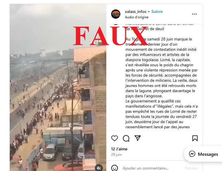 En observant les images de près, on constate que la vidéo a été enregistrée depuis un bâtiment surplombant une route à deux voies, type autoroute. Selon la publication, les images proviennent du Togo et ont été prises le « samedi 28 juin », « le troisième et dernier jour d’un mouvement de contestation inédit initié par des influenceurs et artistes de la diaspora togolaise ».
