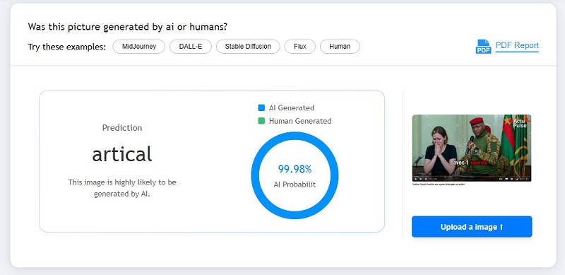Nous avons réalisé une capture d’écran des différentes vidéos. Les outils de détection Undetectable AI et DeCopy AI sont ceux que nous avons utilisé pour la vérification. Ces deux outils précisent que les images ont été générées par une IA avec un pourcentage élevé.