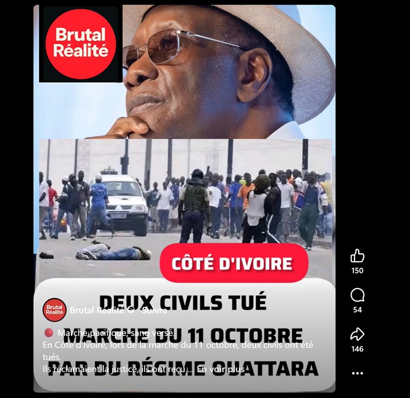 Concernant le bilan de la marche interdite du 11 octobre 2025, le ministère ivoirien de l’Intérieur a fait état de 237 interpellations à Abidjan et 18 à Dabou, une ville située à une quarantaine de kilomètres de la capitale économique. Dans une publication faite sur Facebook, la page Brutal Réalité évoque deux civils tués, illustrant son propos par une image montrant deux corps allongés au sol, entourés de manifestants faisant face à des forces de l’ordre.