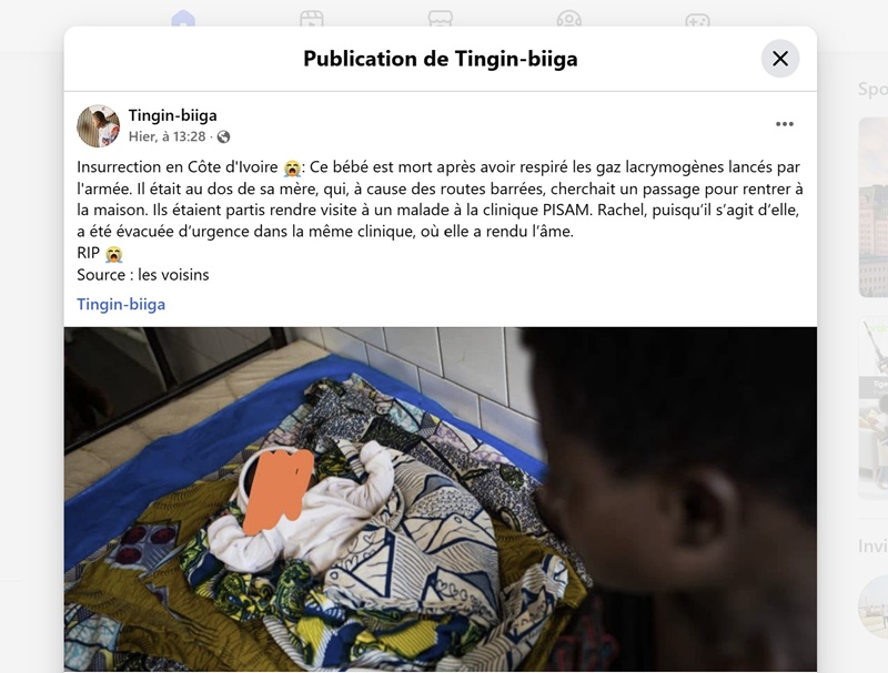 « Insurrection en Côte d’Ivoire : Ce bébé est mort après avoir respiré les gaz lacrymogènes lancés par l’armée. Il était au dos de sa mère, qui, à cause des routes barrées, cherchait un passage pour rentrer à la maison. Ils étaient partis rendre visite à un malade à la clinique PISAM. Rachel, puisqu’il s’agit d’elle, a été évacuée d’urgence dans la même clinique, où elle a rendu l’âme. RIP Source : les voisins », indique le texte qui accompagne l’image d’un bébé enveloppé dans un pagne.