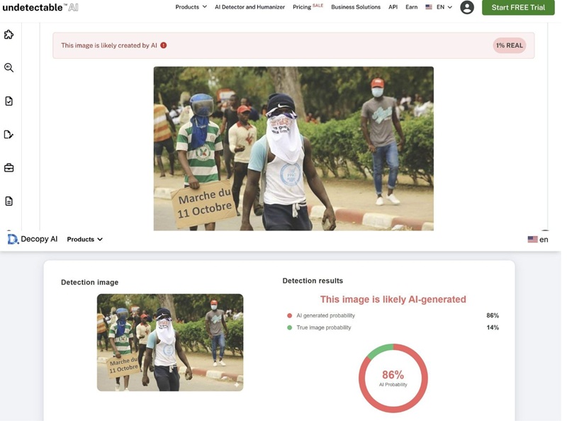 Cette autre image où l’on voit des manifestants tenant des pierres a été modifiée grâce à une intelligence artificielle. Une recherche inversée d’image a permis de retrouver l’image d’origine sur le site Abidjan.net. La photo authentique, publiée le 11 septembre 2018, évoque une « manifestation des étudiants de la FESCI (Fédération estudiantine et scolaire de Côte d’Ivoire) dispersée par les forces de l’ordre ». Une IA a permis de changer la couleur du tee-shirt d’un des manifestants et d’ajouter une pancarte portant la mention « 11 octobre » à l’image d’origine. Les outils Undetectable AI, WasItAI et DeCopy AI ont tous conclu que l’image a été modifiée par une IA.