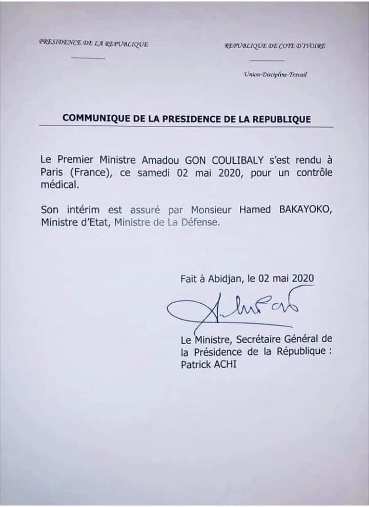 Nous espérons bien nous tromper, mais c’est ce communiqué qui est la seule source (pour le moment et sauf démonstration contraire) de l’intérim du premier ministre. A voir de près l’acte portant intérim du premier ministre ivoirien (le communiqué), rendu public le 2 mai 2020 par le SG de la présidence, il ne s’agit que d’un communiqué, donc destiné à porter au grand public une information. Laquelle information, pour juridiquement « grave » qu’elle est, devrait avoir pour, support un décret qui lui donnerait force juridique.