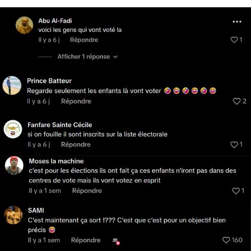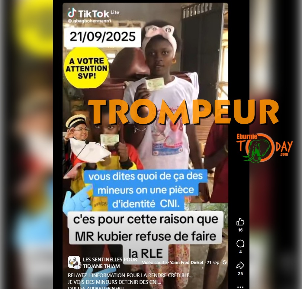 Un internaute qui partage la vidéo sur TikTok s’étonne que des enfants (mineurs) puissent avoir une CNI. Dans une publication Facebook reprenant la même vidéo, l’auteur du post a inscrit deux phrases sur les images de la vidéo : « vous dites quoi de ça des mineurs on une pièce d’identité CNI (sic) » puis « c’es pour cette raison que MR kubier refuse de faire la RLE (sic) ».