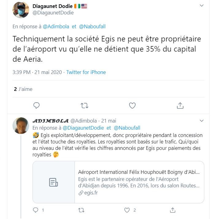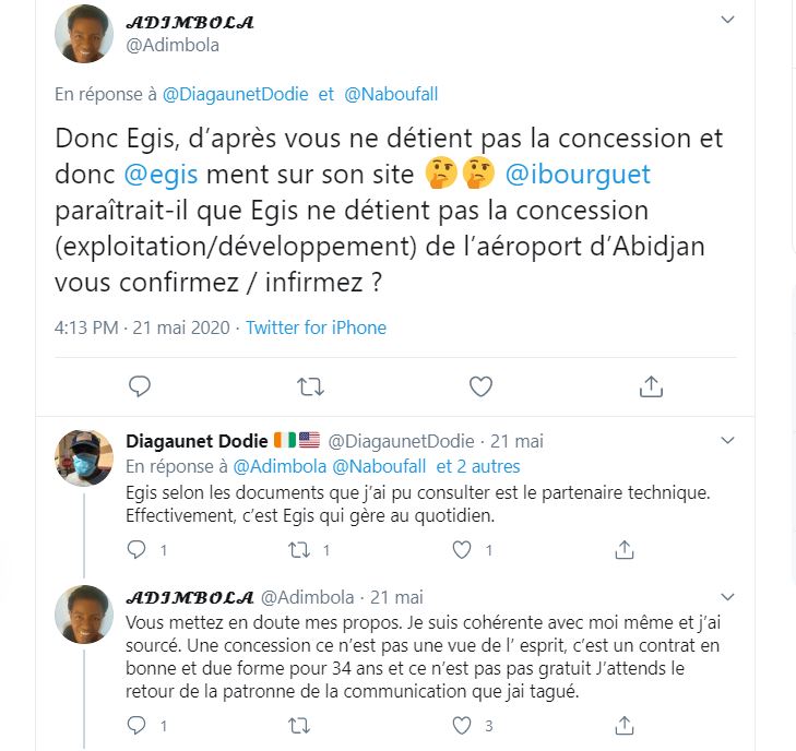Si dans le premier tweet l’internaute semblait poser une question, les échanges suscités par son tweet ont permis de connaitre sa position et de mieux comprendre la tournure de ce tweet initial. En effet, face à la réponse d’un autre internaute qui indique que « techniquement EGIS ne peut être propriétaire de l’aéroport d’Abidjan », elle répond que Egis est bien « propriétaire pendant la concession ».