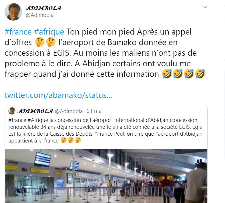 Cette fois sur l’aéroport de Bamako, l’internaute ne s’est pas embarrassée de question rhétorique. Le propos est affirmatif et moqueur avec une référence à son tweet sur l’aéroport d’Abidjan. Selon elle, la concession de l’aéroport de Bamako aurait été accordée à… Egis, bien-sûr.
