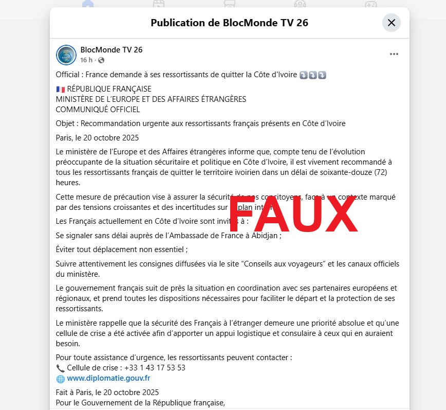 « Official : France demande à ses ressortissants de quitter la Côte d’Ivoire (sic) », voici la phrase par laquelle débute un long texte attribué au Ministère français de l’Europe et des affaires étrangères. La publication évoque, comme raison de cette recommandation, « l’évolution préoccupante de la situation sécuritaire et politique en Côte d’Ivoire ».