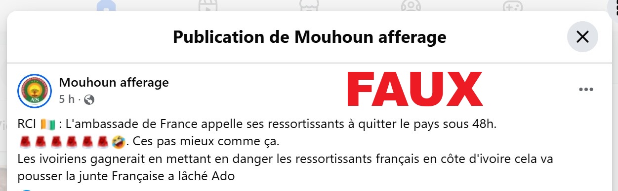 Une autre publication attribue l’ordre d’évacuation ou de départ à l’Ambassade de France à Abidjan. « L’ambassade de France appelle ses ressortissants à quitter le pays sous 48h » indique cette publication qui invite les ivoiriens à mettre « en danger les ressortissants français en côte d’ivoire cela va pousser la junte Française a lâché Ado (sic) ».
