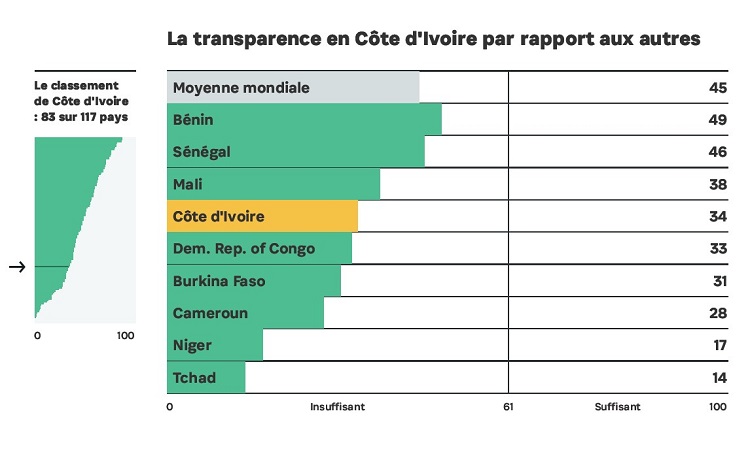 Au niveau de la transparence, l’’enquête sur le budget ouvert mesure l’accès du public aux informations sur la façon dont le pouvoir central collecte et dépense les ressources publiques. Elle évalue la disponibilité en ligne, la disponibilité à temps et l’exhaustivité de huit documents budgétaires clés : rapport préalable au budget (produit à usage interne), projet de budget de l’exécutif, budget approuvé, budget des citoyens (pas encore produit en 2018), rapports en cours d’année (non produit en 2018), revue de milieu d’année, rapport de fin d’année (produit mais à usage interne), rapport d’audit. La Côte d’Ivoire obtient un score de transparence de 34 sur 100, alors qu’il faut un score de transparence de 61 ou plus pour indiquer qu’un pays est susceptible de publier suffisamment de documents pour favoriser un débat public informé sur le budget.