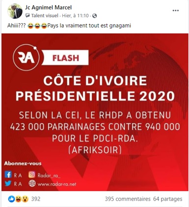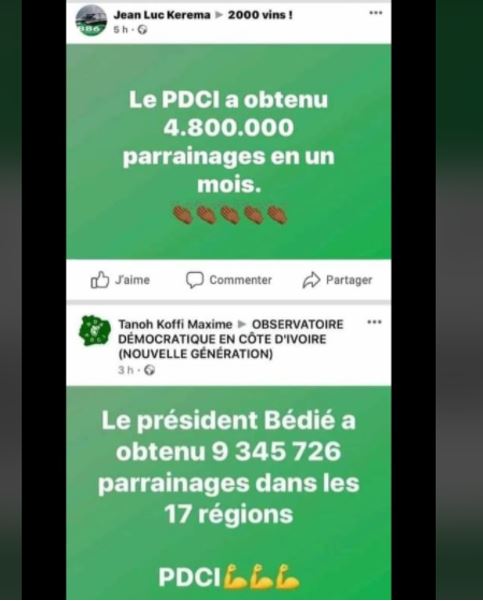 De son côté, le PDCI-RDA n’a pas officiellement communiqué sur le nombre de parrainage recueilli par son candidat, le président Henri Konan Bédié. N’empêche, de nombreuses publications dans les réseaux sociaux notamment sur facebook donnent des chiffres du nombre de parrainage recueilli par le candidat du PDCI-RDA. A commencé par cette publication où l’on peut lire que selon la CEI, le RHDP a obtenu 423 000 parrainages contre 940 000 pour le PDCI-RDA.