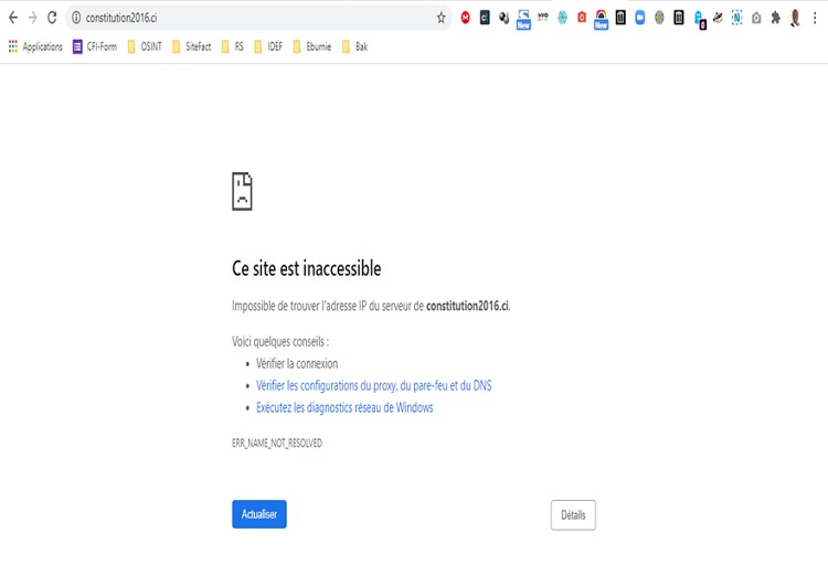 Avant même de s’intéresser à l’information que véhicule l’affiche, il est important de s’assurer de la source de l’information. Sur l’affiche, il est marqué un site internet comme source de l’information ; il s’agit du site constitution2016.ci. La requête constitution2016.ci sur un moteur de recherche, débouche sur une page inaccessible comme on peut le voir sur cette capture d’écran.