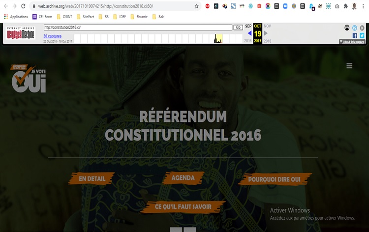 De toute évidence ce site internet, s’il a existé par le passé, n’existe plus à ce jour. Pour retrouver la trace de ce site, il faut employer d’autres moyens techniques. Avec les outils de vérification en ligne notamment wayback machine, l’on a pu retrouver le site avant sa fermeture. Comme on peut le voir sur la capture d’écran ci-dessous, le site constitution2016.ci a bien existé. L’outil wayback machine a réalisé 30 captures du site entre le 25 octobre 2015 et 19 octobre 2019. C’est grâce à cette action qu’il est possible de retrouver le site alors qu’il est inaccessible directement.