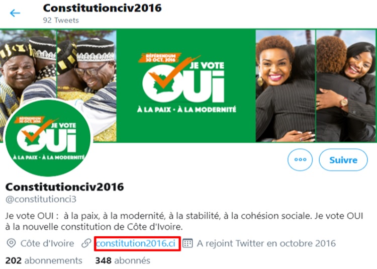 Comme l’on peut le voir, l’url du site indique bien, http://constitution2016.ci. Le site a été retiré du web mais il a bien existé. Par ailleurs, le compte Twitter dédié à communication sur la constitution est toujours accessible et mentionne bien le site web constitution2016.ci dans sa description comme le montre cette capture.