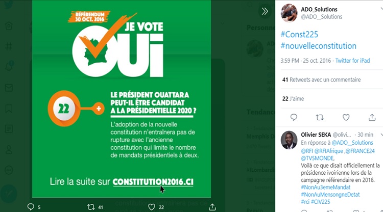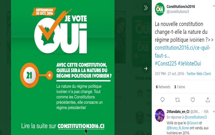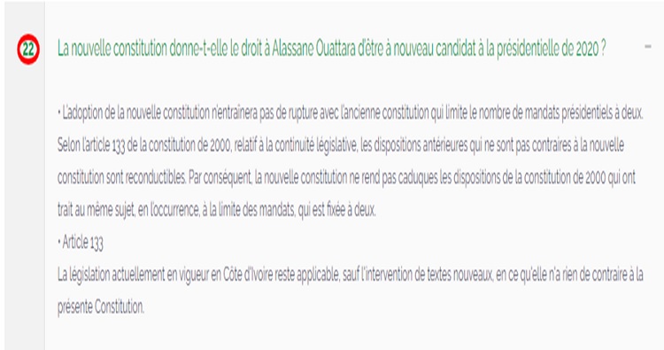 Le site web www.constitution2016.ci a été créé pour « mieux comprendre » la constitution et répondre aux questions clés liées à cette nouvelle constitution. Ainsi, 53 points clés ont été expliqués dans la partie « ce qu’il faut savoir » du site web dont le point 22 est mis en avant dans les réseaux sociaux. L’affiche qui circule dans les réseaux sociaux en ce moment a même été relayée par le compte Ado solution, l’un des deux comptes du président République Alassame Ouattara.