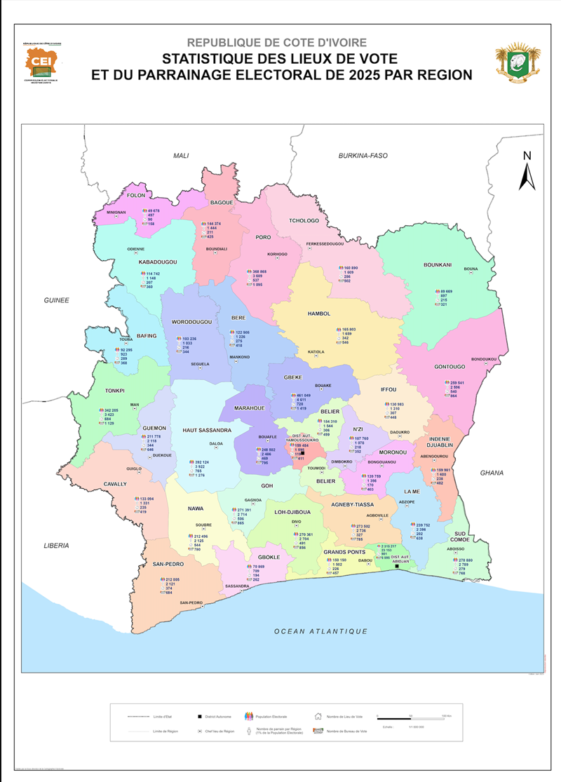 Le parrainage citoyen pour l’élection présidentielle en Côte d’Ivoire repose sur plusieurs articles du Code électoral ivoirien en vigueur (ordonnance n° 2020-356 du 08 avril 2020 portant révision du code électoral, NDLR). Il s’agit des articles 25, 51, 53, 54 et 56 qui encadrent les conditions de recevabilité des candidatures, en précisant que tout candidat doit être soutenu par une liste d’électeurs représentant au moins 1 % de l’électorat local dans 50 % des régions ou districts autonomes, soit au minimum 17 entités territoriales. En 2025, la Côte d’Ivoire est organisée en 12 districts ordinaires et deux districts autonomes – Abidjan et Yamoussoukro – qui ne sont pas divisés en régions. Les districts ordinaires sont divisés en 31 régions. Chaque région constitue une entité administrative et une collectivité territoriale, dotée d’un chef-lieu et d’un conseil régional.