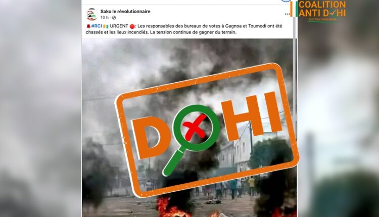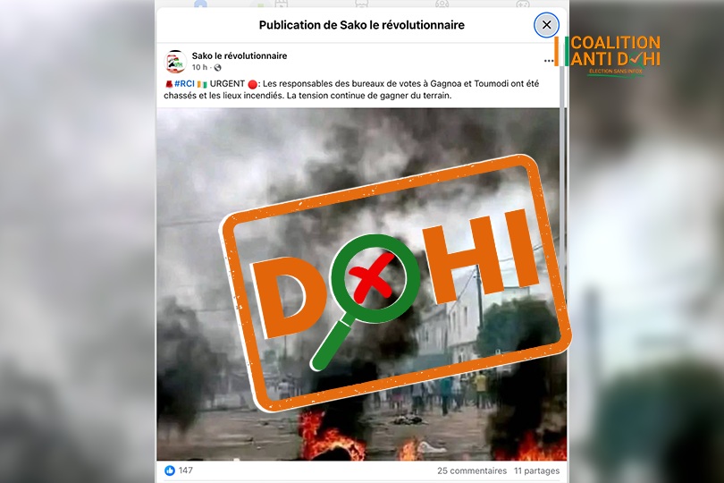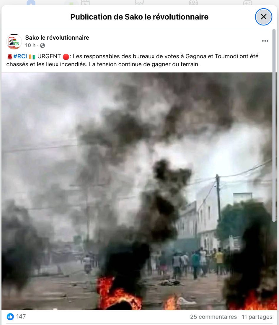 Par exemple, une publication faite sur Facebook ce 25 octobre 2025 par la page Sako Le Révolutionnaire soutient que des responsables de bureaux de votes ont pris la fuite. « URGENT : Les responsables des bureaux de votes à Gagnoa et Toumodi ont été chassés et les lieux incendiés. La tension continue de gagner du terrain », lit-on dans le texte qui accompagne cette publication. Le post a également été relayé sur Facebook par les pages Côte d’Ivoire Ma Patrie et Le Renouveau Ivoirien. La publication a également été reprise ici , ici , ici , ici , ici , ici , ici, ici