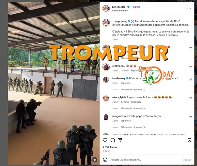« Entraînement des encagoulés de TENE BIRAHIMA pour le kidnapping des opposants ivoiriens à domicile. C’était au 43 Bima il y a quelques mois« , voici la description qui accompagne une vidéo partagée sur X et Instagram. Sur les images de la vidéo on peut voir des hommes en uniformes évoluant sur un site composé de plusieurs compartiments. Lors de leurs manœuvres, les hommes armés se saisissent d’individus en tenue civile qu’ils conduisent vers un véhicule. La publication Instagram datée du 8 août 2025 précise aussi que « la séance a été supervisée par le ministre français de la défense Sébastien Lecornu« .