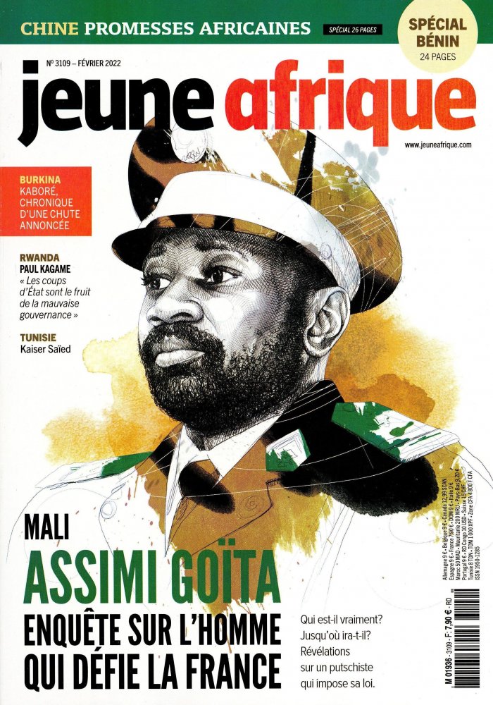 Il a y donc un gros déphasage entre le numéro et la date d’édition de la fausse une qui circule et le véritable n°3088 de JA. Pour retrouver Assimi Goïta à la une de Jeune Afrique, il faut juste remonter à février 2022. Le patron de la transition au Mali est à la une du n°3109 du magazine.