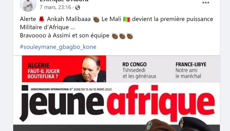 La couverture trompeuse de Jeune Afrique est aussi présente sur Facebook. On la retrouve sur la page L’Afrique d’Abord. L’administrateur de la page félicite Assimi Goïta et son équipe pour cet exploit relayé par le très ‘’sérieux’’ magazine.